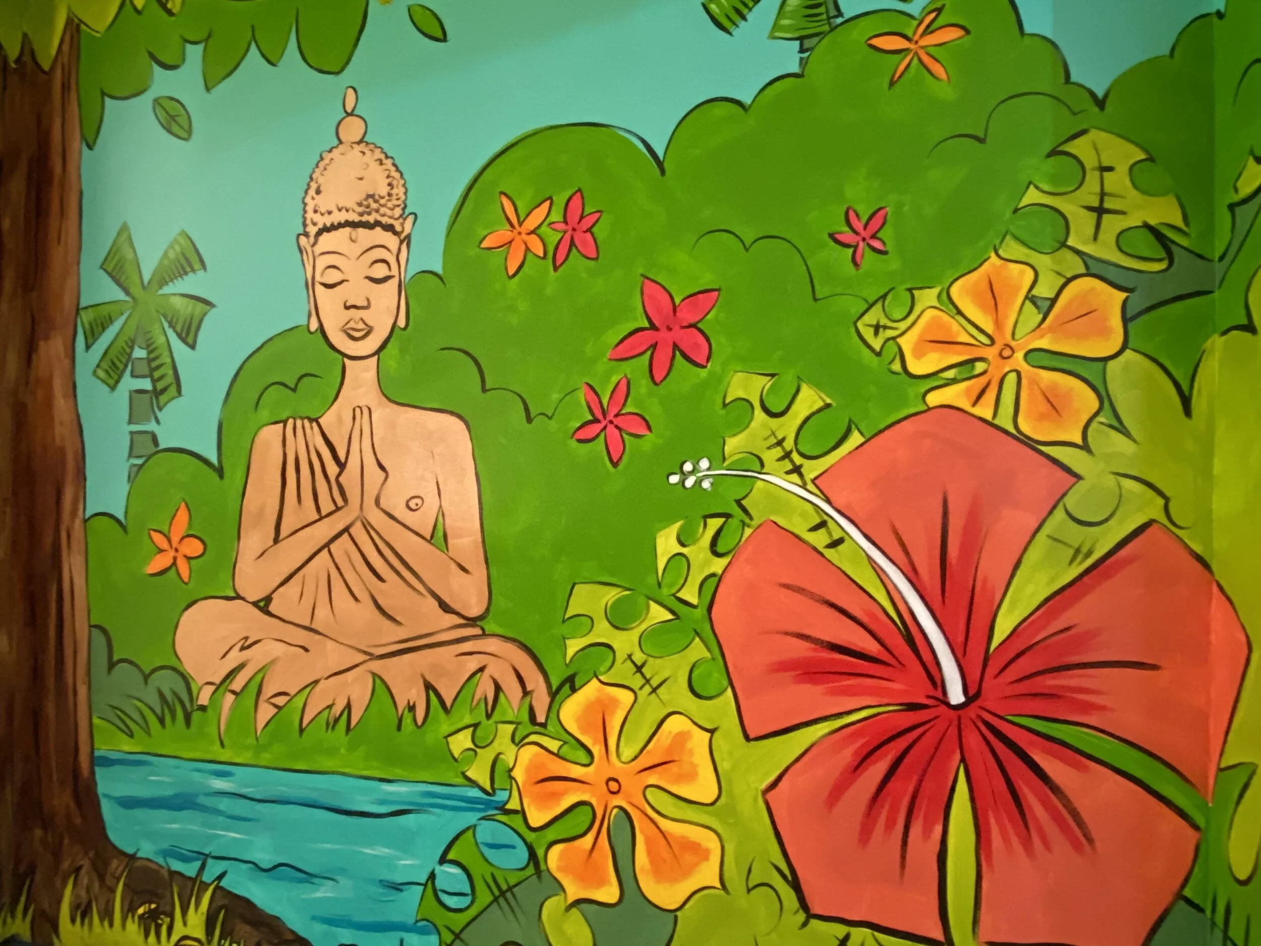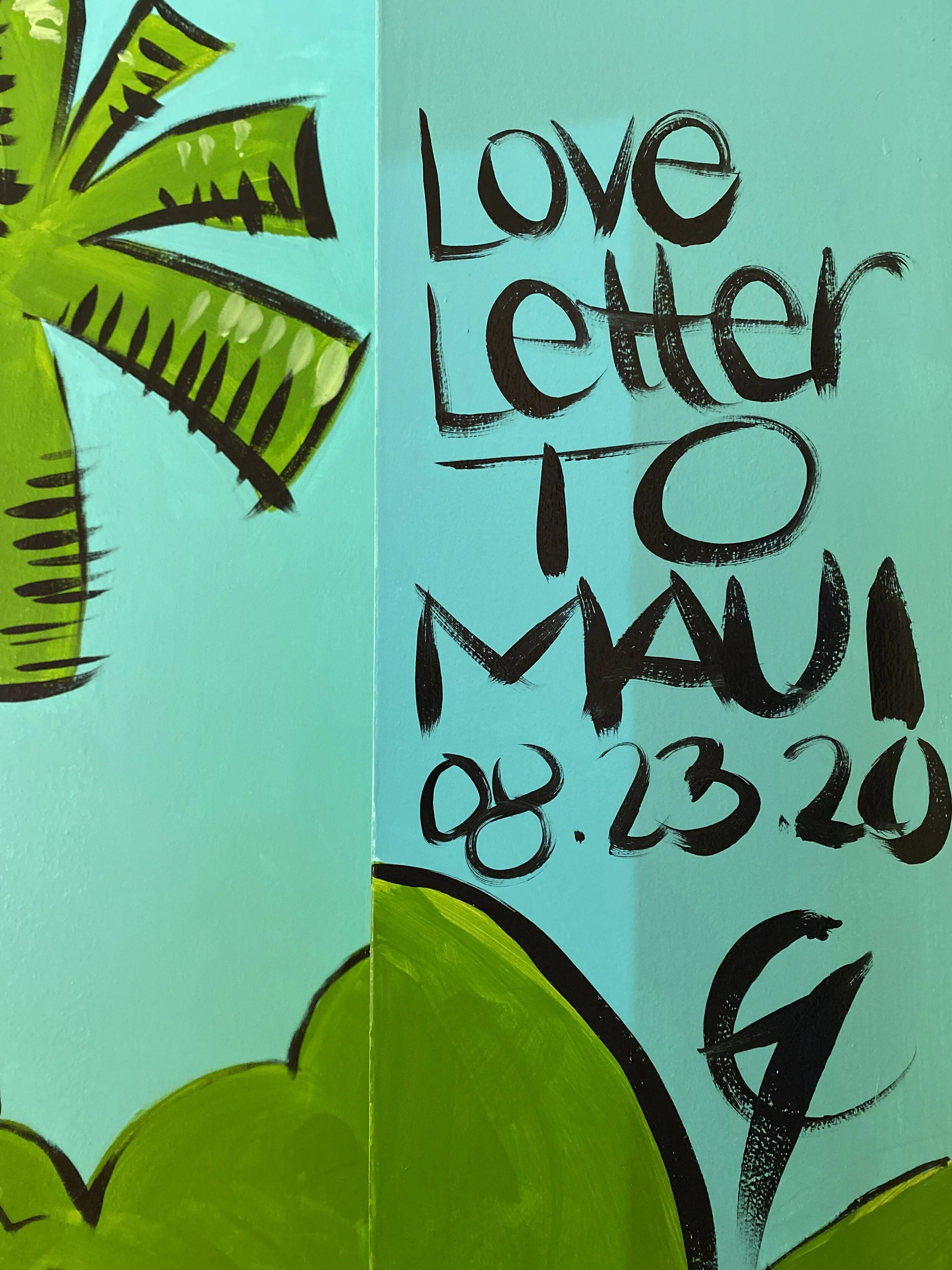 You all KNEW from the beginning that I wasn’t a big blogger and here we are again….. after a break I will do my best to do this…..I am trying to get in a habit of doing something here as well and creatively each day…..but that isn’t easy and I will have to MAKE myself do it and get into the habit….anyway….. the journaling class is coming along and once again I have really enjoyed the class. I wont be taking the next one due to scheduling conflicts with market as well as not having enough time to devote to the class the last three weeks it is around…..and I want to be there for the class but think this time around I will skip it. I will return to it though again as I enjoyed it and Amie is a great instructor. I am considering taking a teaching art online class with another group to help better my skills to offer something similar to what they are doing in Virginia. I think it would be great to be able to teach from a distance….fun even! :)…..I have also JUST finished work on my mural project which is down in my studio….wow….that was a labor of love and I really am happy with the outcome. It is colorful, fun, energetic and shows my love of my favorite place….MAUI!….titled “Love Letter to Maui” the front wall is probably at least 20 feet across and the side wall is probably about 20 feet as well. Each wall is at least 8 feet tall and some of o the visual goes up onto 4 foot overhang on the ceiling…..I just love it!!!!!! I will include some photos here to show you. well until next time folks….be kind to yourself….and to one another! @